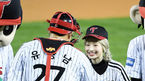 [OSEN=잠실, 지형준 기자] 10일 오후 서울 잠실야구장에서 '2019 신한은행 MY CAR KBO 포스트시즌' 준플레이오프 4차전 키움 히어로즈와 LG 트윈스의 경기가 열렸다.경기에 앞서 트와이스 다현이 시구를 마치고 LG 유강남과 인사를 나누