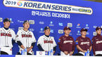 [OSEN=잠실, 최규한 기자] 21일 오후 서울 잠실야구장에서 ‘2019 신한은행 마이카 KBO 한국시리즈’ 두산 베어스와 키움 히어로즈의 미디어데이가 열렸다.두산 김태형 감독 오재일-이영하, 키움 장정석 감독과 이지영-이정후