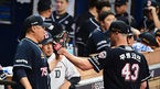 [OSEN=고척, 지형준 기자] 25일 오후 서울 고척스카이돔에서 ‘2019 신한은행 MY CAR KBO리그 포스트시즌’ 키움 히어로즈와 두산 베어스의 한국시리즈 3차전이 열렸다.6회초 수비를 마치고 두산 후랭코프가 조인성, 김원형 코치