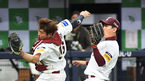 [OSEN=고척, 이대선 기자] 26일 오후 서울 고척스카이돔에서 ‘2019 신한은행 MY CAR KBO리그 포스트시즌’ 키움 히어로즈와 두산 베어스의 한국시리즈 4차전이 열렸다.8회초 2사에서 키움 이지영과 송성문이 두산 김재환의 타구