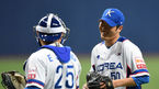 [OSEN=고척, 이대선 기자] 2019 세계야구소프트볼연맹(WBSC) 프리미어12에 출전하는 한국 야구 국가대표팀이 29일 오후 서울 고척스카이돔에서 상무와의 연습경기를 가졌다.1회말 수비를 마친 대표팀 박종훈이 포수 양의지와 이야기