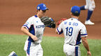 [OSEN=고척, 곽영래 기자] 8일 오후 서울 고척스카이돔에서 '2019 세계야구소프트볼연맹(WBSC) 프리미어12' 예선 C조 대한민국과 쿠바의 경기가 열렸다.7회초 이닝을 마친 한국 고우석이 김하성과 글러브 터치를 하고 있다. /youngrae@osen