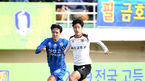 [OSEN=제천, 최규한 기자] 27일 오후 충북 제천종합운동장에서 ’제74회 전국고교축구선수권 겸 왕중왕전’ 결승 울산 현대고와 광주 금호고의 경기가 열렸다.전반 광주 금호고 송주민이 울산 현대고 전성진의 수비를 받으