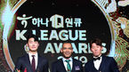[OSEN=지형준 기자] 2일 오후 서울 홍은동 그랜드힐튼호텔에서 하나원큐 K리그 2019 대상 시상식이 열렸다.전북 현대 홍정호가 K리그1 MVP를 수상한 울산 현대 김보경을 축하해주고 있다. /jpnews@osen.co.kr