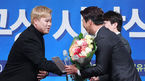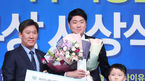 [OSEN=민경훈 기자] 6일 오전 서울 청담동 리베라호텔에서 ‘2019 일구상 시상식’이 열렸다.시상자로 나선 LA 다저스 류현진이 일구대상을 수상한 SK 김광현과 KIA 양현종에게 꽃다발을 전달하고 있다. / rumi@osen.co.kr