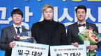 [OSEN=민경훈 기자] 6일 오전 서울 청담동 리베라호텔에서 ‘2019 일구상 시상식’이 열렸다.일구대상을 수상한 SK 김광현과 KIA 양현종이 시상자로 나선 LA 다저스 류현진이 함께 포토타임을 갖고 있다. / rumi@osen.co.kr