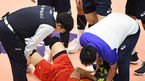 [OSEN=의정부, 곽영래 기자] 18일 오후 의정부 실내체육관에서 '도드람 2019-2020 V-리그' KB손해보험와 한국전력의 경기가 열렸다.1세트 한국전력 김강녕이 동료와 충돌한 뒤 통증을 호소하고 있다. /youngrae@osen.co.kr