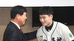 [OSEN=곽영래 기자] 제3회 이만수 포수상 및 홈런상 시상식이 19일 오후 서울 도곡동 한국야구위원회(KBO)에서 열렸다.이만수 전 감독이 포수상을 수상한 유신고 강현우 선수와 포토타임을 갖고 있다. /youngrae@osen.co.kr
