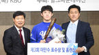 [OSEN=곽영래 기자] 제3회 이만수 포수상 및 홈런상 시상식이 19일 오후 서울 도곡동 한국야구위원회(KBO)에서 열렸다.이만수 전 감독이 포수상을 수상한 유신고 강현우 선수에게 상패와 상금을 전달하고 있다. /youngrae@osen.co.kr
