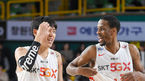 [OSEN=창원, 박준형 기자] 19일 경남 창원시 의창구 창원스포츠파크 내 창원체육관에서 2019-2020 현대모비스 KBL 프로농구 창원 LG와 서울 SK의 경기가 진행됐다.2쿼터 하프타임 종료 후 서울 SK 최준용과 헤인즈가 이야기를 나누며 코
