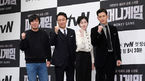 [OSEN=조은정 기자] 8일 오후 서울 강남구 임피리얼 팰리스 서울 호텔에서 tvN '머니게임' 제작발표회가 열렸다.김상호 감독, 배우 이성민, 심은경, 고수가 포즈를 취하고 있다. /cej@osen.co.kr