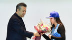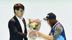 [OSEN=인천, 최규한 기자] 9일 오후 인천 서구 하나글로벌캠퍼스에서 ‘한국여자농구연맹(WKBL) 2019-2020시즌 신입 선수 선발회’가 열렸다.1라운드 2순위 신한은행이 외국 동포 선수 애나킴을 지명한 뒤 정상일 감독이 꽃다발