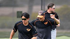 [OSEN=메사(미국 애리조나주)지형준 기자] 29일(한국시간) 미국 애리조나주 메사 레드마운틴 베이스볼 콤플렉스에 스프링캠프를 차린 한화 이글스. 한승주, 남지민, 김민우가 훈련을 하고 있다. /jpnews@osen.co.kr
