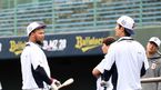 [OSEN=미야자키(일본), 이대선 기자] 1일 (한국시간) 일본 미야자키 소켄구장에서 두산 베어스의 스프링캠프가 진행됐다.두산 페르난데스와 김재호가 타격 훈련을 하며 이야기를 나누고 있다. /sunday@osen.co.kr