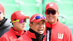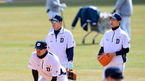 [OSEN=지형준 기자] 13일 오후 서울 잠실야구장에서 두산 베어스가 자체 훈련을 진행했다.외야수들이 수비 훈련을 준비하며 미소짓고 있다. /jpnews@osen.co.kr