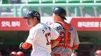 [OSEN=고척, 이대선 기자] 키움 히어로즈 선수단이 22일 오후 서울 고척스카이돔에서 자체 청백전을 가졌다.4회말 키움 백팀 박병호가 좌월 안타를 치고 오윤 코치와 하이파이브를 하고 있다./sunday@osen.co.kr