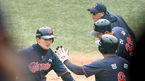 [OSEN=김해, 최규한 기자] 1일 오후 경상남도 김해 상동구장에서 롯데 자이언츠의 자체 청백전 경기가 열렸다.3회초 2사 2루 상황 롯데 김민수가 달아나는 좌월 투런포를 날리고 홈을 밟으며 정훈-허일과 인사를 나누고 있다. / drea