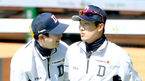 [OSEN=잠실, 김성락 기자] 8일 오전 서울 잠실야구장에서 두산 베어스 훈련이 진행됐다.박건우가 허경민을 향해 미소짓고 있다. /ksl0919@osne.co.kr