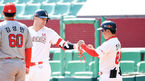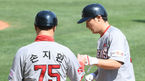 [OSEN=인천, 조은정 기자] 14일 오후 인천 SK행복드림구장에서 SK 와이번스 ‘퓨쳐스 vs 수펙스’의 자체 연습경기가 열렸다.4회초 퓨쳐스 선두타자 최지훈이 1루타를 쳐낸 뒤 손지환 코치와 주먹을 맞대고 있다. /cej@osen.co.kr