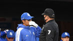 [OSEN=부산, 민경훈 기자] 23일 오후 부산 사직구장에서 롯데 자이언츠와 삼성 라이온즈의 연습경기가 열렸다. 3회초 문승훈 구심이 삼성 코치진들에게 복장에 대해 주의를 주고 있다. / rumi@osen.co.kr