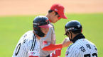 [OSEN=잠실, 조은정 기자] 24일 오후 서울 송파구 잠실야구장에서 LG 트윈스와 SK 와이번스가 연습경기를 가졌다.5회말 LG 선두타자 오지환이 3루타를 때린 뒤 김재걸 코치와 주먹을 치고 있다. /cej@osen.co.kr