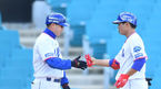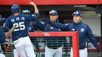[OSEN=광주, 민경훈 기자] 27일 오후 광주 기아 챔피언스필드에서 KIA 타이거즈와 NC 다이노스의연습경기가 열렸다. 2회초 1사 주자 1,2루 NC 노진혁의 우익수 뒤 선취 1타점 적시타때 홈을 밟은 양의지가 덕아웃에서 이동욱 감독과