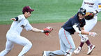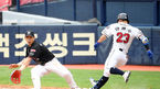 [OSEN=잠실, 곽영래 기자] 10일 오후 서울 잠실야구장에서 '2020 신한은행 SOL KBO리그' 두산 베어스와 KT 위즈의 경기가 열렸다.4회말 무사 1루 두산 안권수가 투수 앞 번트때 KT 김민의 1루 송구 실책으로 2루까지 진루하고 있다. /youngra