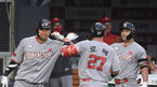[OSEN=잠실,박준형 기자] 14일 오후 서울 잠실구장에서 ‘2020 신한은행 SOL KBO리그’ LG 트윈스와 SK 와이번스의 경기가 진행됐다.2회초 SK 선두타자 로맥이 선취 솔로홈런을 날리고 한동민과 정의윤의 축하를 받고 있다. / soul10