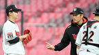 [OSEN=수원 , 곽영래 기자] 16일 오후 수원 KT위즈파크에서 '2020 신한은행 SOL KBO리그' KT 위즈와 삼성 라이온즈의 경기가 열렸다.5회초 무사 만루 KT 박승민 코치가 마운드에 올라 김민과 이야기를 나누고 있다. /youngrae@osen.co.kr