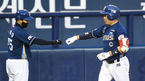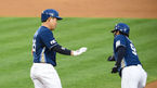 [OSEN=잠실,박준형 기자] 20일 오후 서울 잠실구장에서 KBO리그 두산 베어스와 NC 다이노스의 경기가 진행됐다.4회초 1사 NC 양의지가 동점 솔로홈런을 날리고 3루 코치와 하이파이브를 하고 있다. / soul1014@osen.co.kr