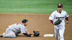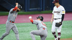 [OSEN=수원 , 민경훈 기자] 21일 오후 수원 KT위즈파크에서 '2020 신한은행 SOL KBO리그' KT 위즈와 한화 이글스의 경기가 열렸다.8회초 무사 주자 1루 한화 정진호의 1루수 앞 병살타때 1루 주자 한화 이용규가 KT 1루수 박승욱에게 터치