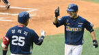 [OSEN=잠실, 최규한 기자] 21일 오후 서울 잠실야구장에서 ‘2020 신한은행 SOL KBO리그’ 두산 베어스와 NC 다이노스의 경기가 열렸다.1회초 무사 1, 2루 상황 NC 나성범의 선제 1타점 적시타 때 홈을 밟은 박민우가 양의지와 인