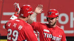 [OSEN=수원, 최규한 기자] 28일 오후 경기도 수원 KT위즈파크에서 ‘2020 신한은행 SOL KBO리그’ KT 위즈와 KIA 타이거즈의 경기가 열렸다.5회초 2사 2루 상황 KIA 나지완이 추격의 좌월 투런포를 날리고 홈을 밟은 뒤 터커와 인사
