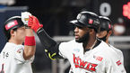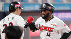 [OSEN=수원 , 민경훈 기자] 3일 오후 수원 KT위즈파크에서 '2020 신한은행 SOL KBO리그' KT 위즈와 두산 베어스의 경기가 열렸다.5회말 2사 KT 로하스가 좌월 솔로홈런을 날린 후 덕아웃 앞에서 장성우와 하이파이브를 하고 있다. /rumi@osen