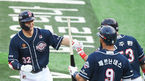 [OSEN=수원,박준형 기자]4일 오후 경기도 수원시 수원KT위즈파크에서 KBO리그 KT 위즈와 두산 베어스의 경기기 진행됐다.1회초 2사 1루 두산 김재환이 선취 2점 홈런을 날리고 페르난데스와 하이파이브를 하고 있다.. / soul1014@osen.co.kr