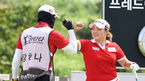 [OSEN=제주, 곽영래 기자] 7일 제주도 서귀포시 롯데스카이힐 제주 컨트리클럽에서 '제10회 롯데 칸타타 여자오픈(총상금 8억원, 우승상금 1억6000만원)' 최종 라운드가 진행됐다.장하나가 티샷에 앞서 캐디와 세레머니를 하고 있다.