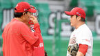 [OSEN=대구, 지형준 기자] 23일 오후 대구삼성라이온즈파크에서 ‘2020 신한은행 SOL KBO리그’ 삼성 라이온즈와 한화 이글스의 경기가 열렸다.1회 한화 최원호 감독대행과 정경배 코치가 경기를 지켜보고 있다. /jpnews@osen.co.kr