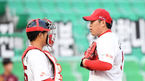 [OSEN=인천, 민경훈 기자] 17일 오후 인천 SK행복드림구장에서 ‘2020 신한은행 SOL KBO리그’ SK 와이번스와 키움 히어로즈의 경기가 열렸다.2회초 2사 주자 1,2루 박준태 타석에서 SK 선발 김주한과 이현석이 얘기를 나누고 있다