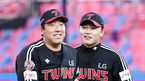 [OSEN=수원,박준형 기자] 3일 오후 경기도 수원시 수원KT위즈파크에서 KBO리그 KT 위즈와 LG 트윈스의 더블헤더 2차전이 진행됐다.3회말 무사 1,2루 LG 이성우 포수가 김윤식 투수와 이야기를 나누고 있다. / soul1014@osen.co.kr
