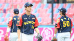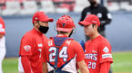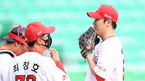 [OSEN=수원,박준형 기자] 3일 오후 경기도 수원시 수원KT위즈파크에서 KBO리그 KT 위즈와 LG 트윈스의 더블헤더 1차전이 진행됐다.5회초 포구 실책으로 무사 1,3루 위기를 맞은 KT 선발투수 김민수가 박승민 투수 코치와 이야기를 나누