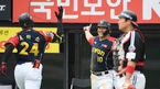 [OSEN=수원,박준형 기자] 3일 오후 경기도 수원시 수원KT위즈파크에서 KBO리그 KT 위즈와 LG 트윈스의 더블헤더 1차전이 진행됐다.3회말 2사 1루 KT 로하스가 선취 2점 홈런을 날린뒤 황재균과 하이파이브를 하고 있다. / soul1014@osen.co.kr