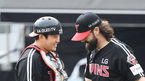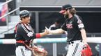[OSEN=수원,박준형 기자] 3일 오후 경기도 수원시 수원KT위즈파크에서 KBO리그 KT 위즈와 LG 트윈스의 더블헤더 1차전이 진행됐다.2회말 KT 문상철의 내야땅볼때 사인미스했던 LG 켈리와 유강남 포수가 하이파이브를 하고 있다. / soul10