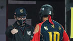 [OSEN=수원,박준형 기자] 3일 오후 경기도 수원시 수원KT위즈파크에서 KBO리그 KT 위즈와 LG 트윈스의 더블헤더 2차전이 진행됐다.8회말 2사 1,2루 KT 황재균이 3점 홈런을 날리고 이강철 감독의 축하를 받고 있다 / soul1014@osen.co.kr