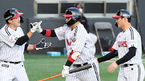 [OSEN=잠실, 민경훈 기자] 9일 오후 서울 잠실구장에서 '2020 신한은행 SOL KBO리그' LG 트윈스와 NC 다이노스의 경기가 열렸다.2회말 1사 주자 1,2루 LG 유강남이 좌월 선취 스리런 홈런을 날린 후 홈을 밟으며 오지환, 양석환에게 축하를