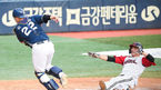 [OSEN=잠실,박준형 기자]11일 오후 서울 잠실구장에서 KBO리그 LG 트윈스와 NC 다이노스의 경기가 진행됐다.8회말 1사 만루 LG 김호은의 내야땅볼 타구때 NC 원종현이 악송구를 던진뒤 홈 베이스를 커버하고 있다. / soul1014@osen.co.kr