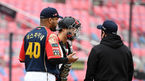 [OSEN=수원, 이대선 기자] 11일 오후 경기도 수원 KT위즈파크에서 ‘2020 신한은행 SOL KBO 리그’ KT 위즈와 두산 베어스의 경기가 열렸다.5회초 1사 1,2루에서 마운드를 방문한 KT 박승민 코치가 데스파이네와 이야기를 나누고