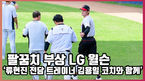 [OSEN=잠실,박준형 기자]'팔꿈치 부상 당한 LG 윌슨 류현진 전담 트레이너와 함께'윌슨은 11일 오후 서울 잠실구장에서 열리는 KBO리그 LG 트윈스와 NC 다이노스의 경기를 앞두고 외야 그라운드에서 김용일 트레이닝 코치와 함께 스