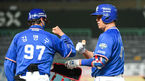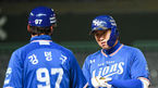 [OSEN=인천,박준형 기자] 20일 오후 인천SK행복드림구장에서 KBO리그 SK 와이번스와 삼성 라이온즈의 경기가 진행됐다.4회초 삼성 선두타자 김동엽이 안타를 날리고 강명구 1루 코치와 하이파이브를 하고 있다 / soul1014@osen.co.kr