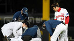 [OSEN=광주, 곽영래 기자] 20일 오후 광주-기아 챔피언스필드에서 '2020 신한은행 SOL KBO리그' KIA 타이거즈와 NC 다이노스의 경기가 열렸다.2회말 2사 NC 송명기가 KIA 김민식의 타구에 맞은 뒤 통증을 호소하고 있다. /youngrae@osen.co.kr