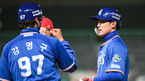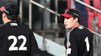 [OSEN=수원, 민경훈 기자] 20일 오후 수원 KT위즈파크에서 '2020 신한은행 SOL KBO리그' KT 위즈와 LG 트윈스의 경기가 열렸다.2회말을 마친 LG 선발 임찬규가 덕아웃으로 들어가며 김현수와 얘기를 나누고 있다./rumi@osen.co.kr